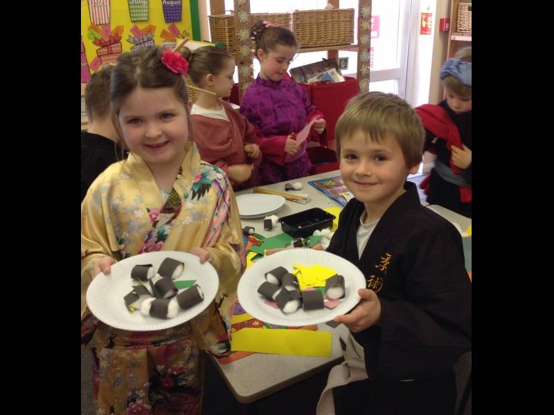 Year 2 enjoyed a fun-filled Japanese Day to celebrate the end of our topic. We had such a busy day making kimonos, writing our names in Japanese script, counting to 10, eating Japanese food with chopsticks, visiting our class sushi bar where children 'created' plates of sushi and we even experienced an earthquake drill, just like our Japanese friends would do at school.